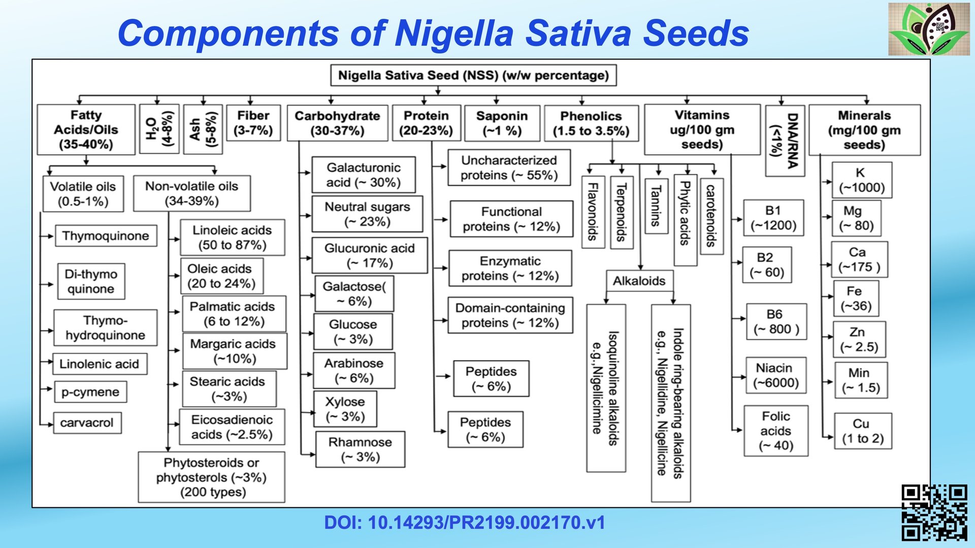 * Black seeds contain fatty acids (35-40%), carbohydrates (30-37%), proteins (20-23%), ash (5-8%), fibers (3-7%), phenolics (1.5-3.5%), minerals (1.5-3.5%), and DNA/RNA (<1%).