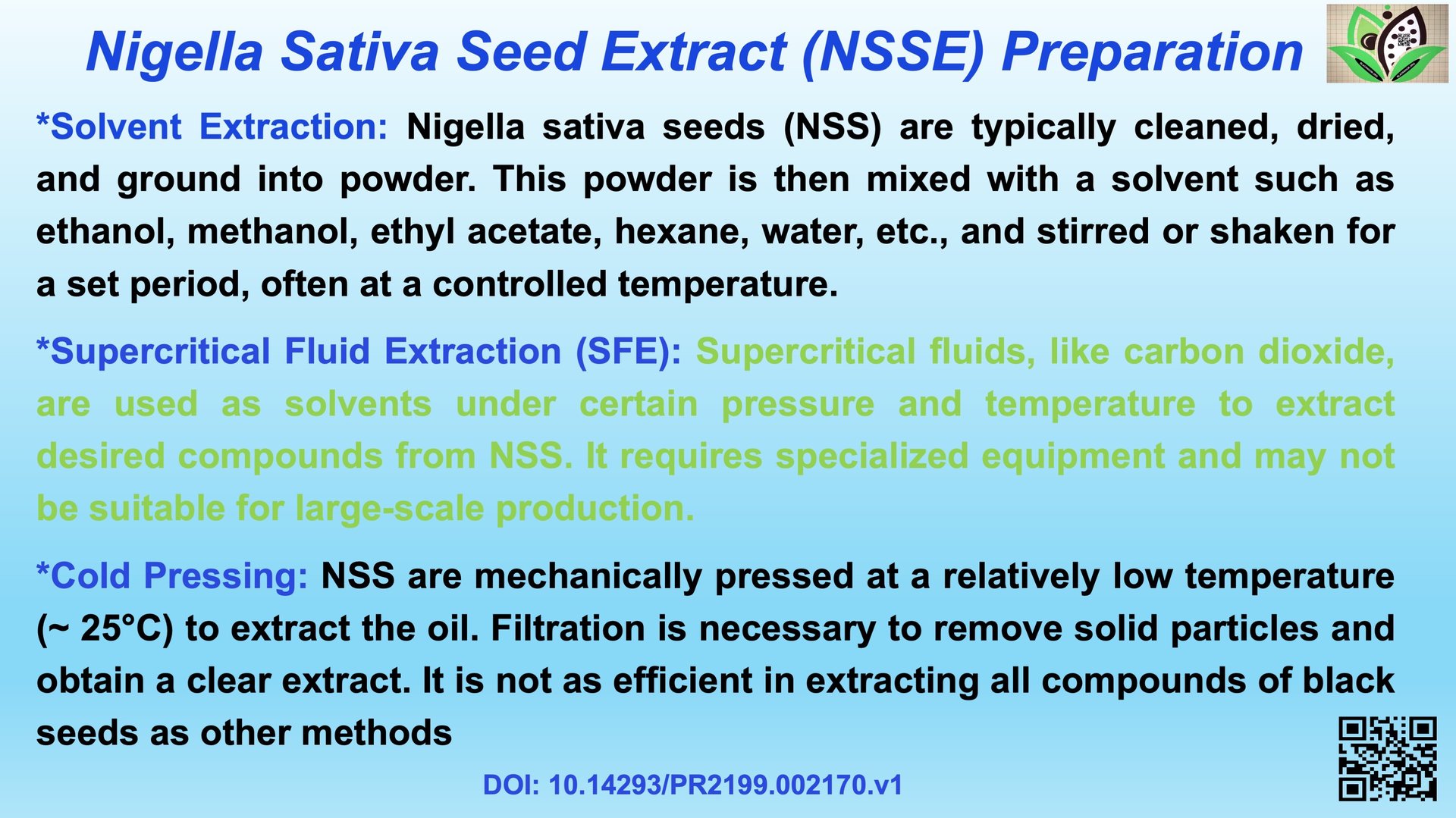 * Here, we present evidence describing the mechanistic effects of NSSE and NSSP on human ailments, taking into account all bioactive constituents, not only thymoquinone.