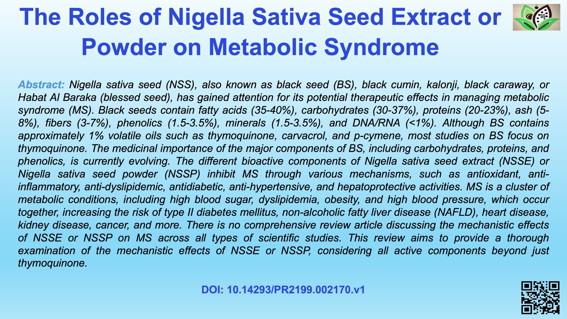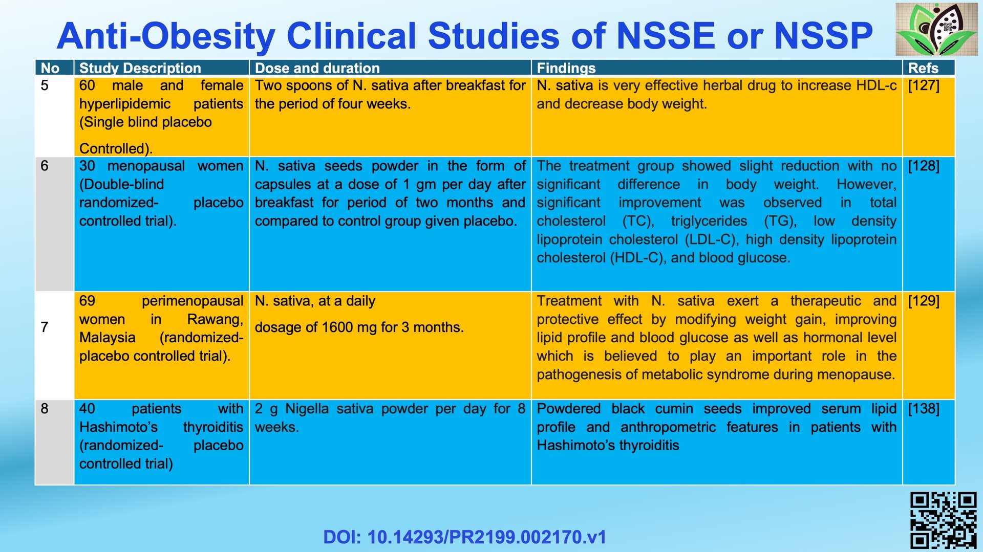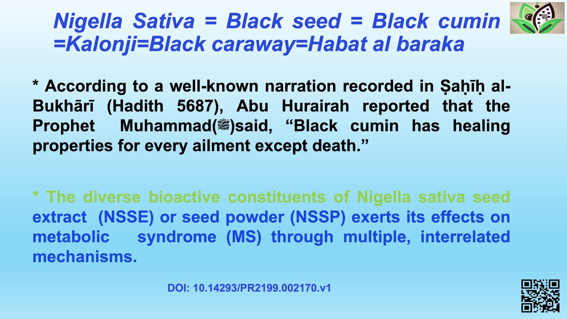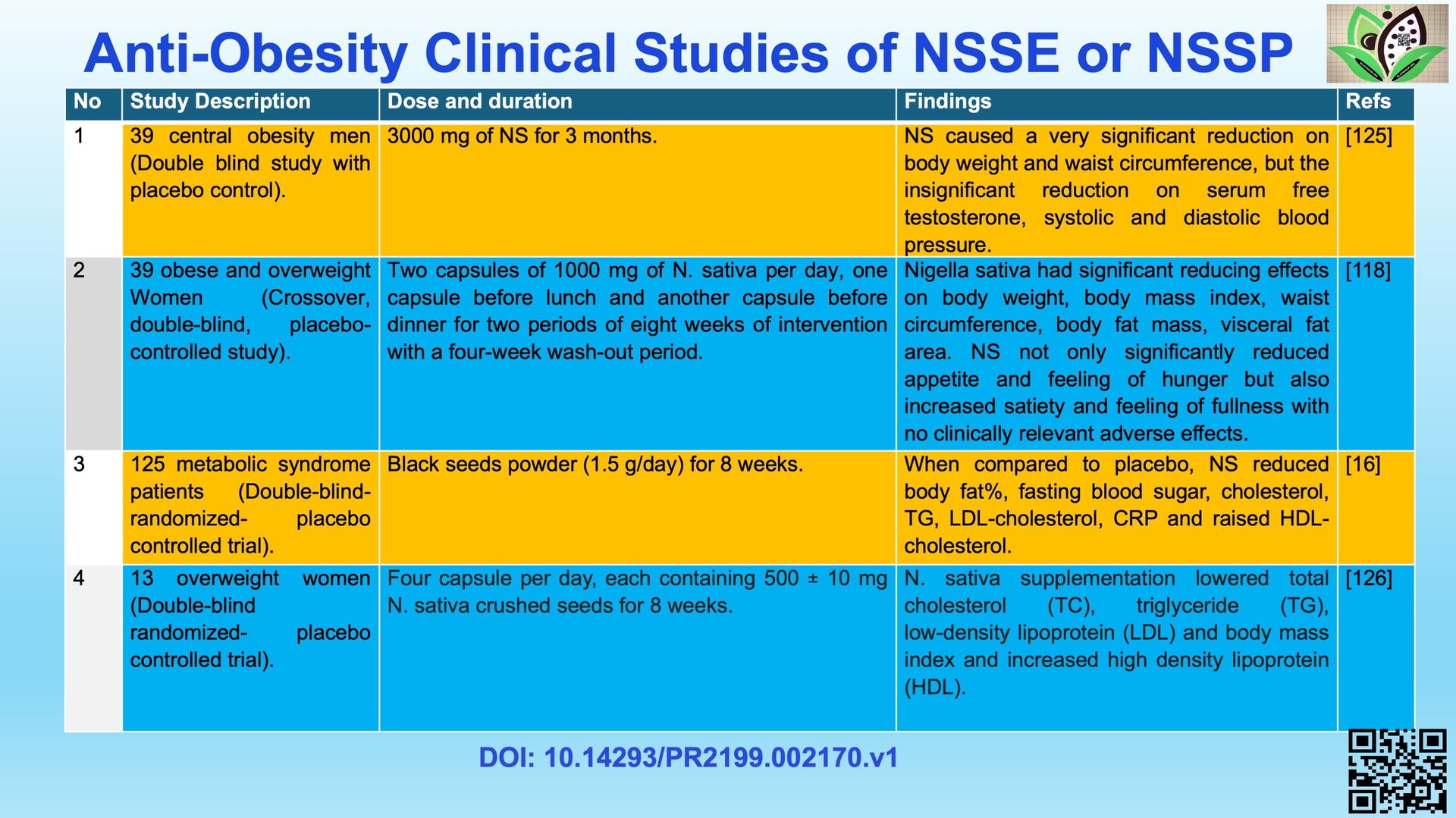* The Roles of Nigella Sativa Seed Extract (NSSE) or Powder (NSSP) on Metabolic Syndrome (https://www.scienceopen.com/hosted-document?doi=10.14293/PR2199.002170.v1
