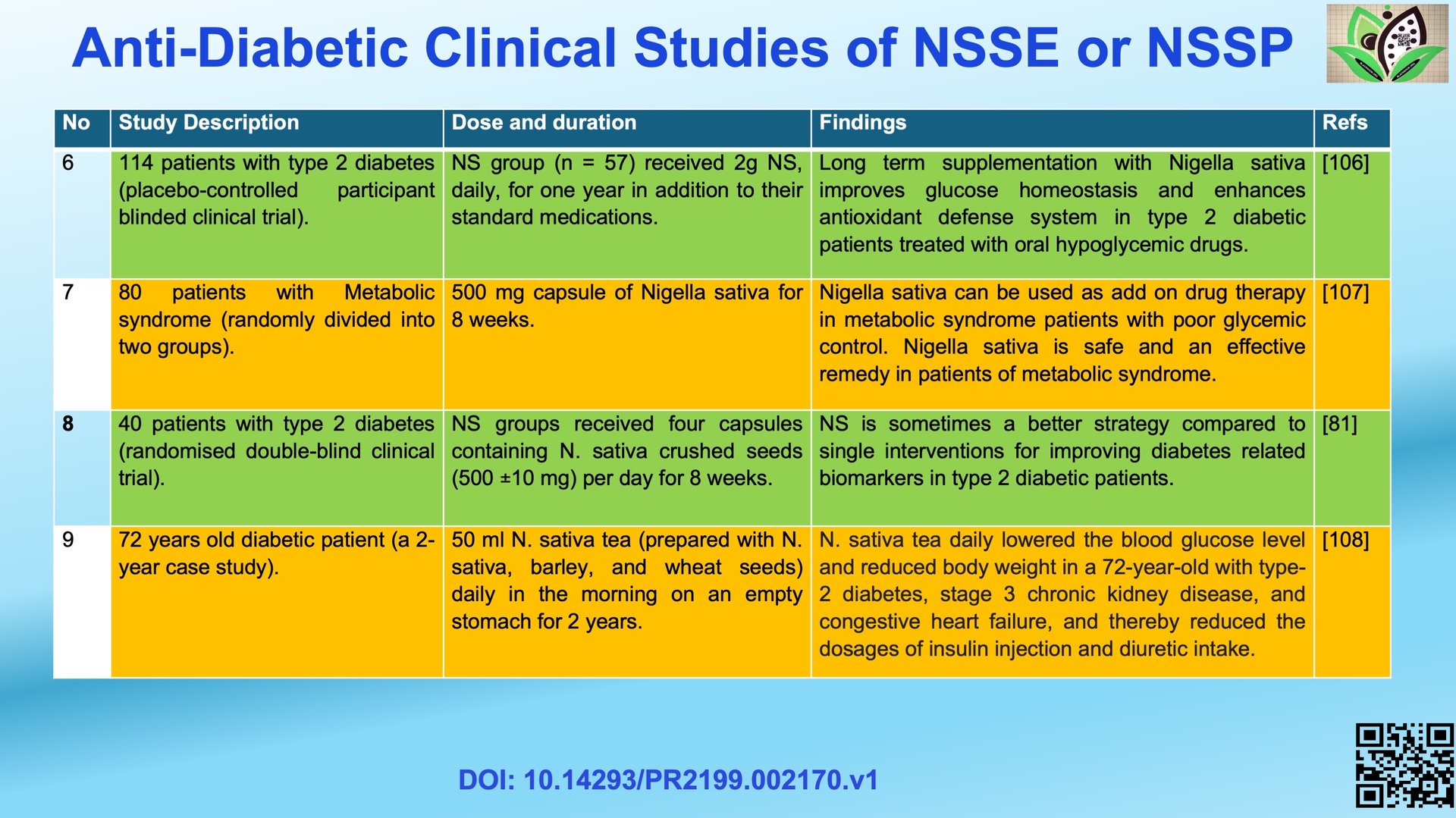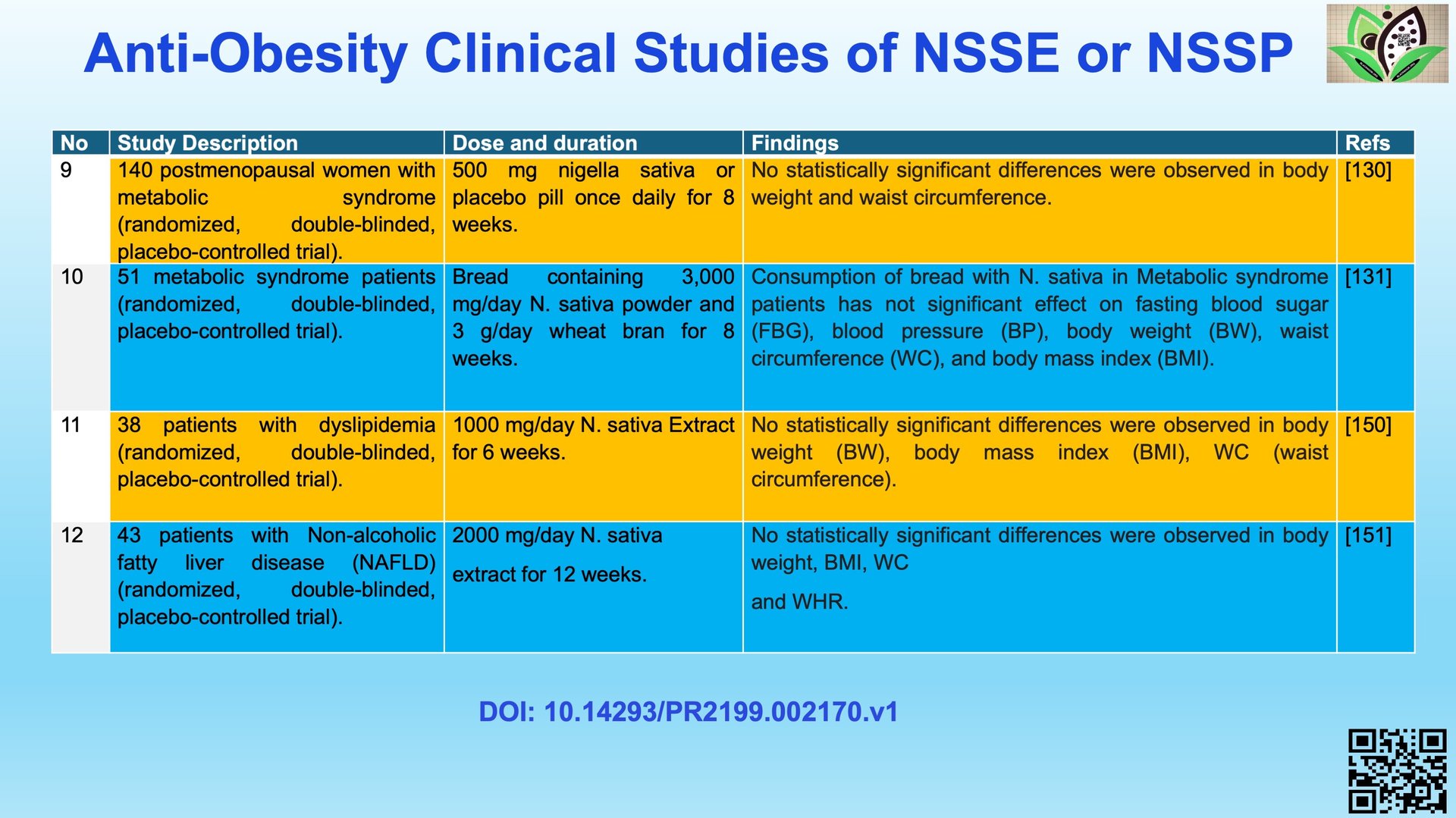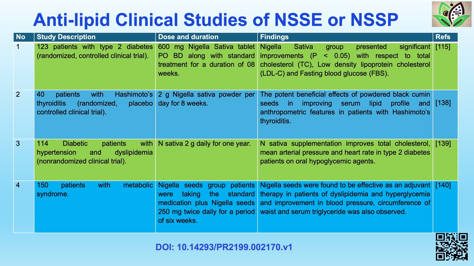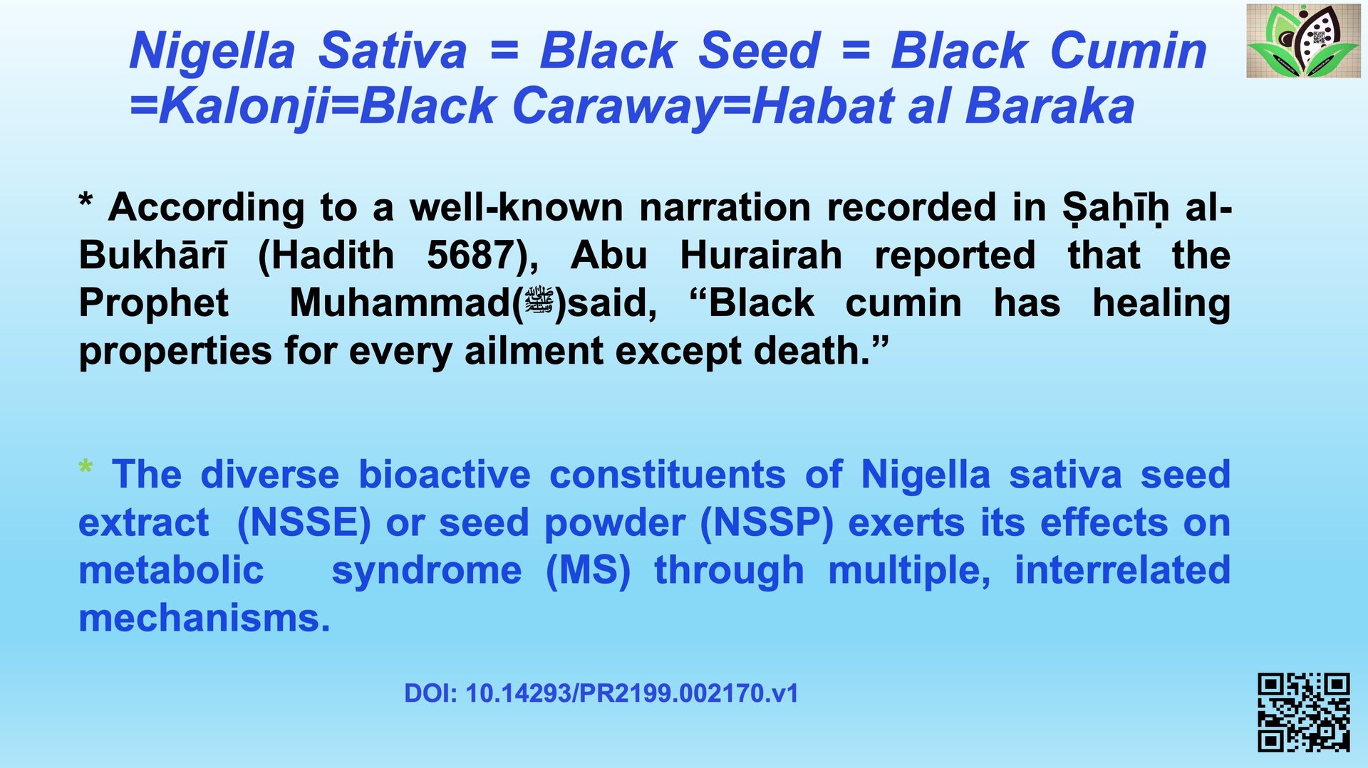 * The Roles of Nigella Sativa Seed Extract (NSSE) or Powder (NSSP) on Metabolic Syndrome (https://www.scienceopen.com/hosted-document?doi=10.14293/PR2199.002170.v1