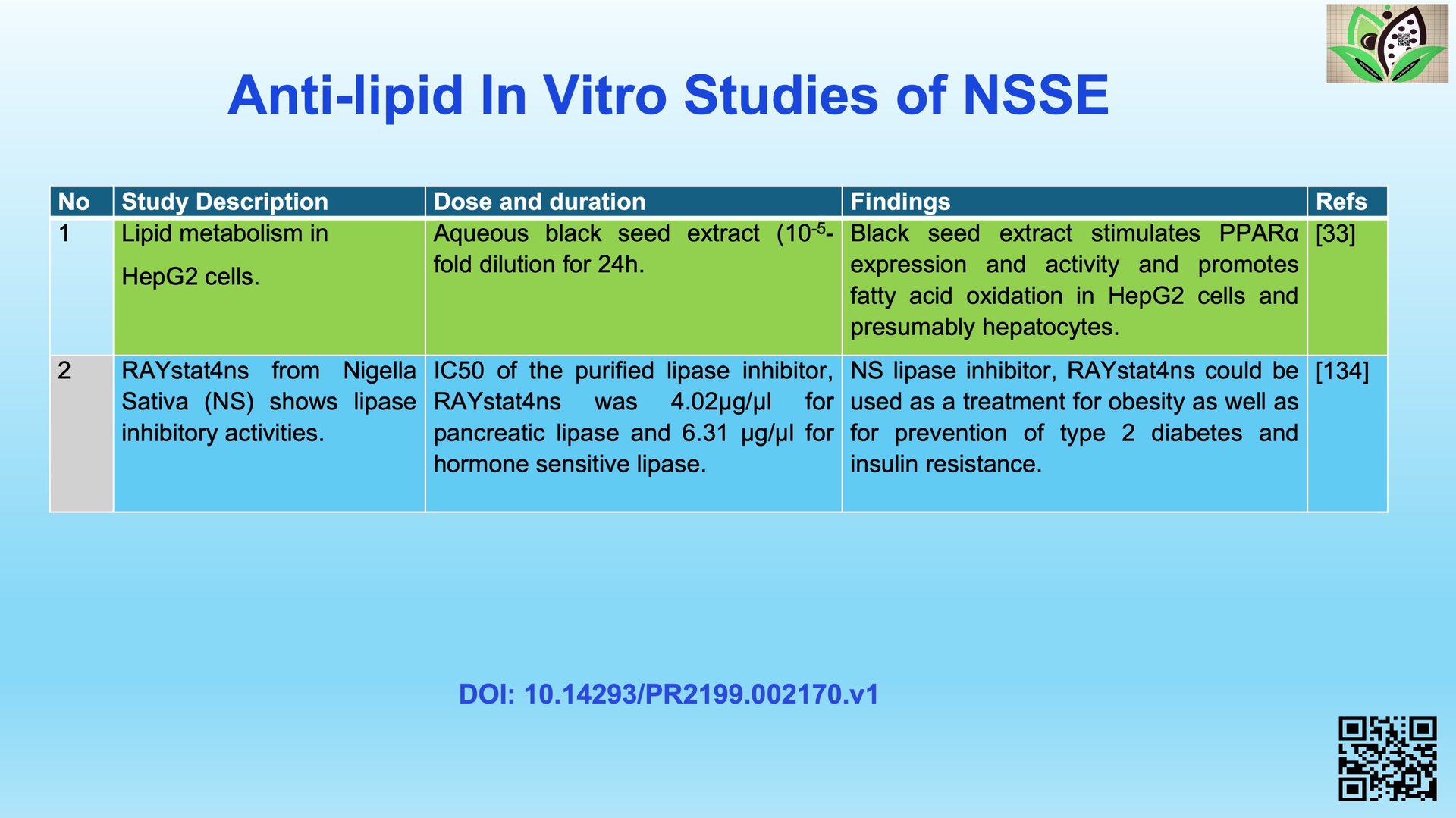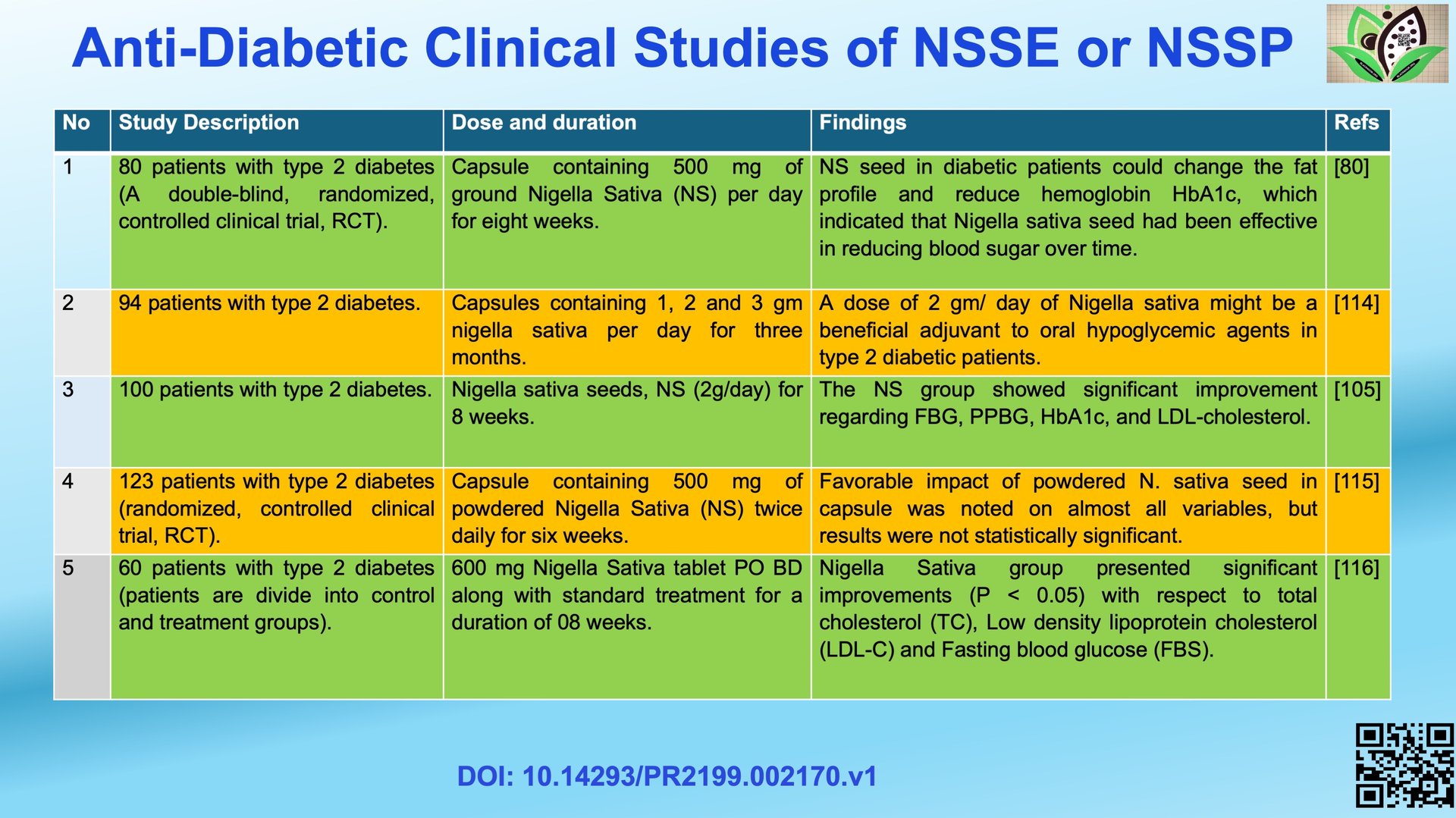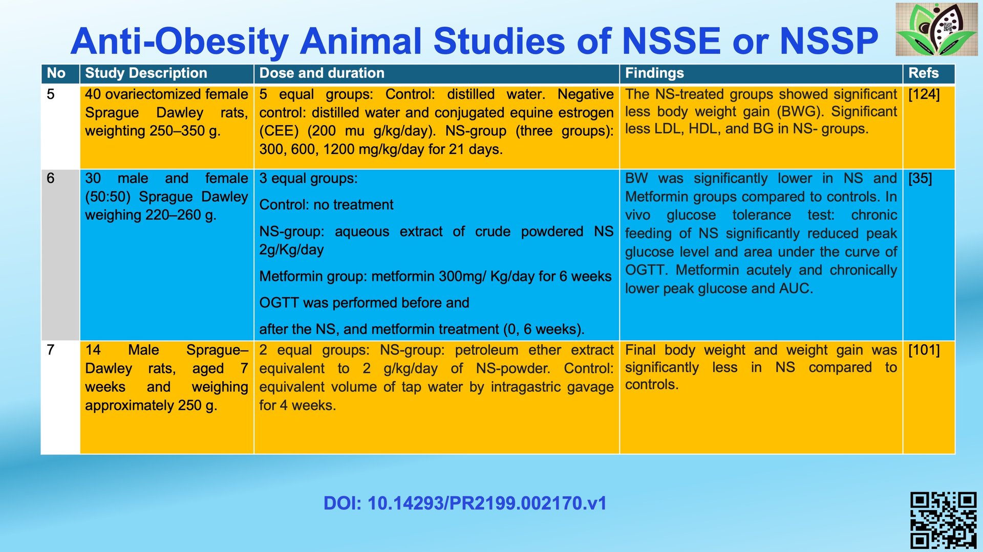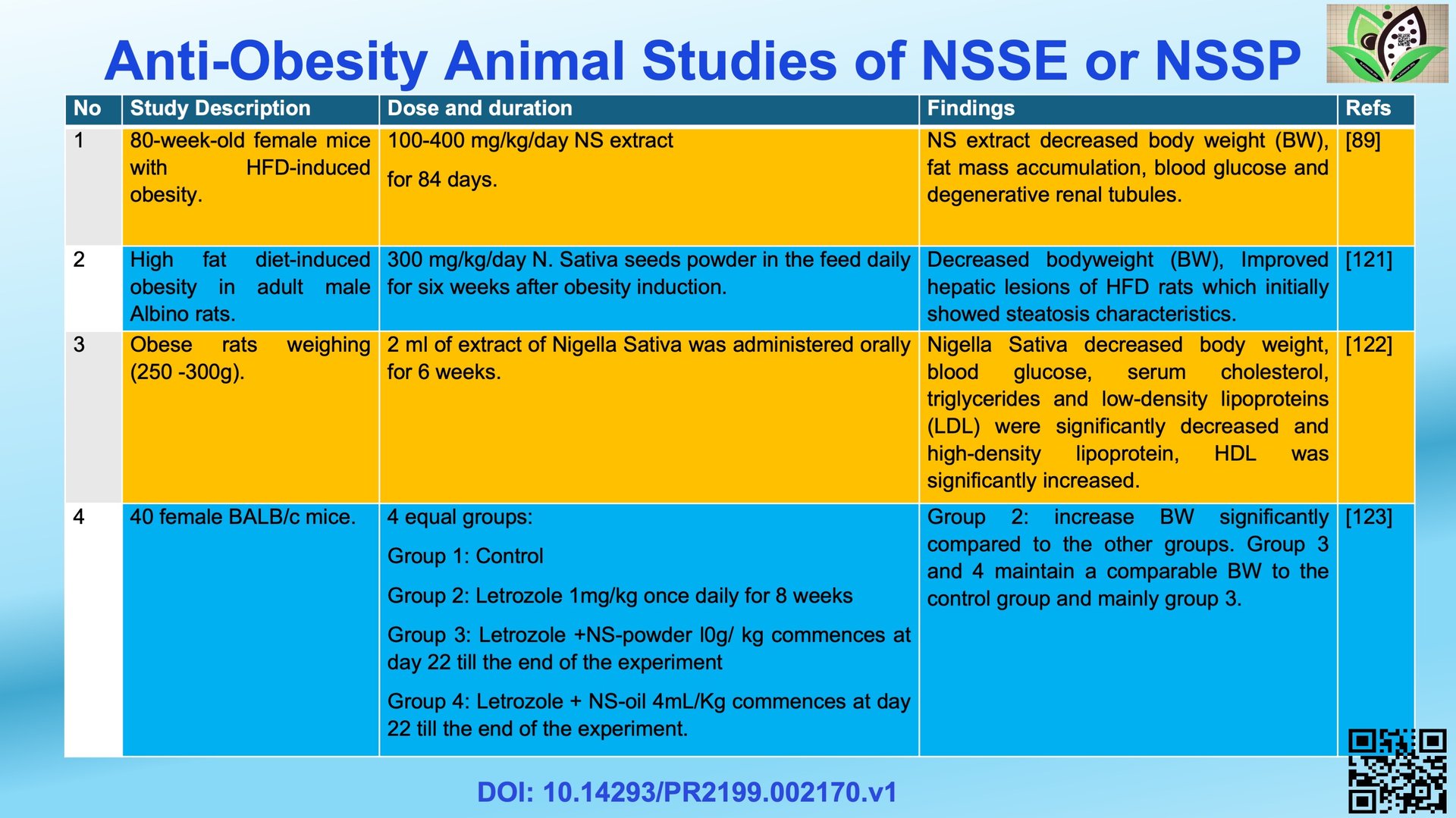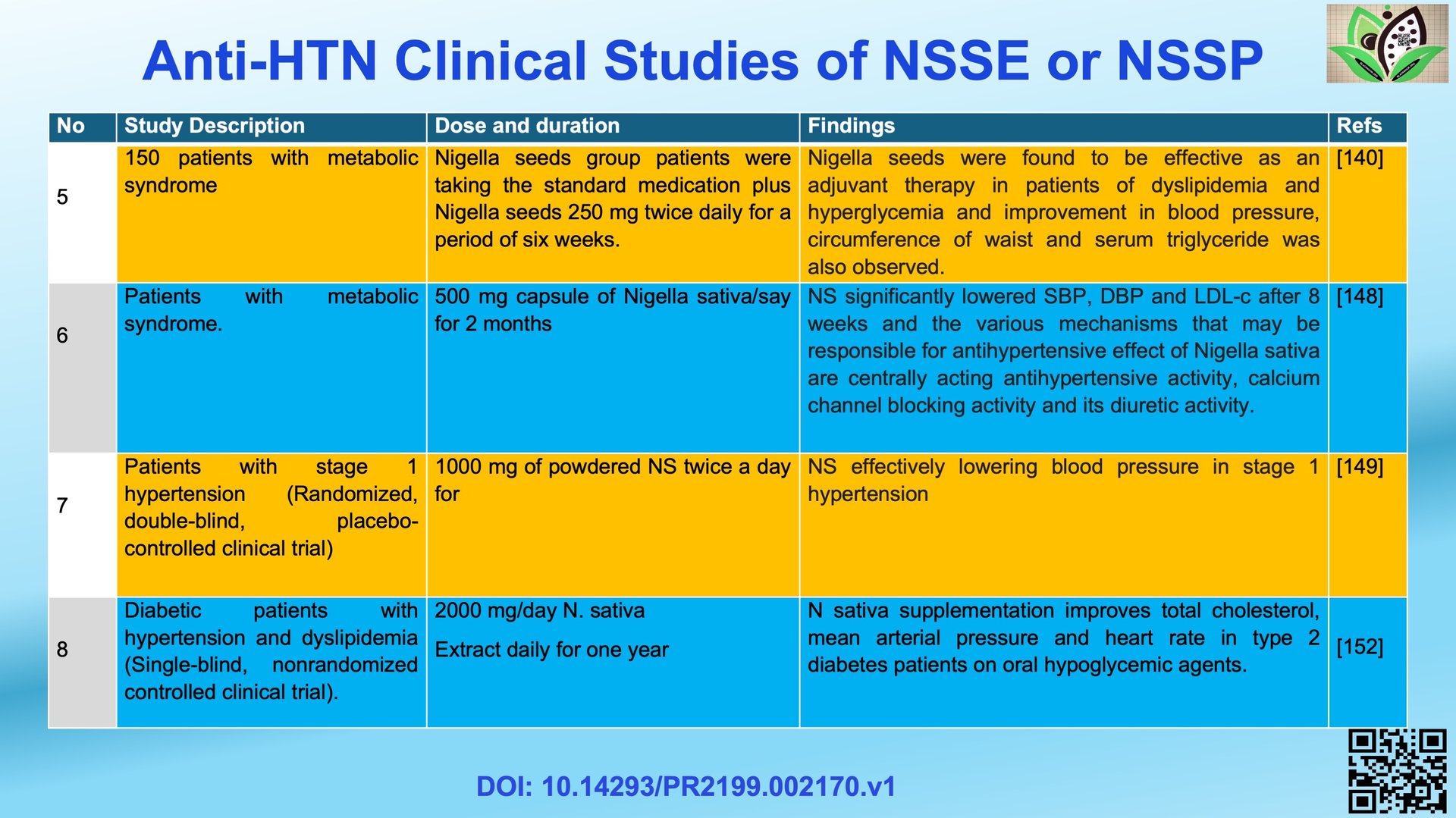 * The Roles of Nigella Sativa Seed Extract (NSSE) or Powder (NSSP) on Metabolic Syndrome (https://www.scienceopen.com/hosted-document?doi=10.14293/PR2199.002170.v1