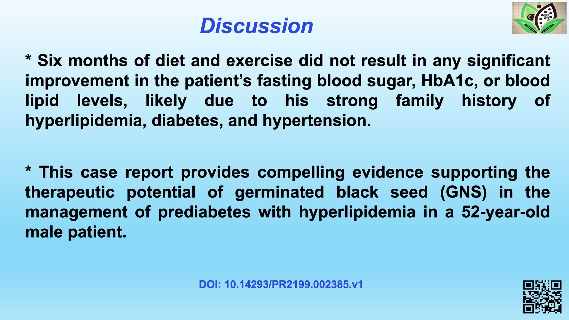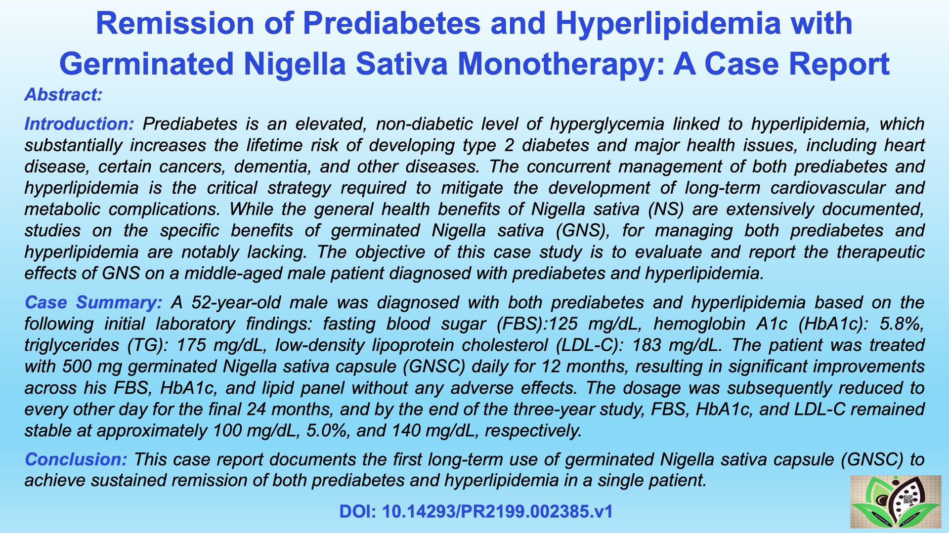 *Remission of Prediabetes and Hyperlipidemia with Germinated Nigella Sativa Monotherapy: A Case Report(https://www.scienceopen.com/hosted-document doi=10.14293/PR2199.002385.v
